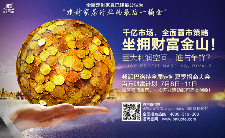 全屋定制品牌邦派巴洛特借展会东风,定于7月-11日在广州总部、一万平方体验式展厅举行夏季招商大会,前10名加盟的客户可获得邦派创业至尊大礼包。【地址:广州市白云区沙太路283号天健广场A座】,详情请QQ咨询:1527294829或拨打全国400热线:4006-310-300目前,邦派巴洛特广州总部一万平方体验式展厅招商大会火热进行中,前来考察的客户不断增加,接待客户车辆以及酒店已爆满,欢迎前来考察的客户提前致电咨询,方便提前安排!